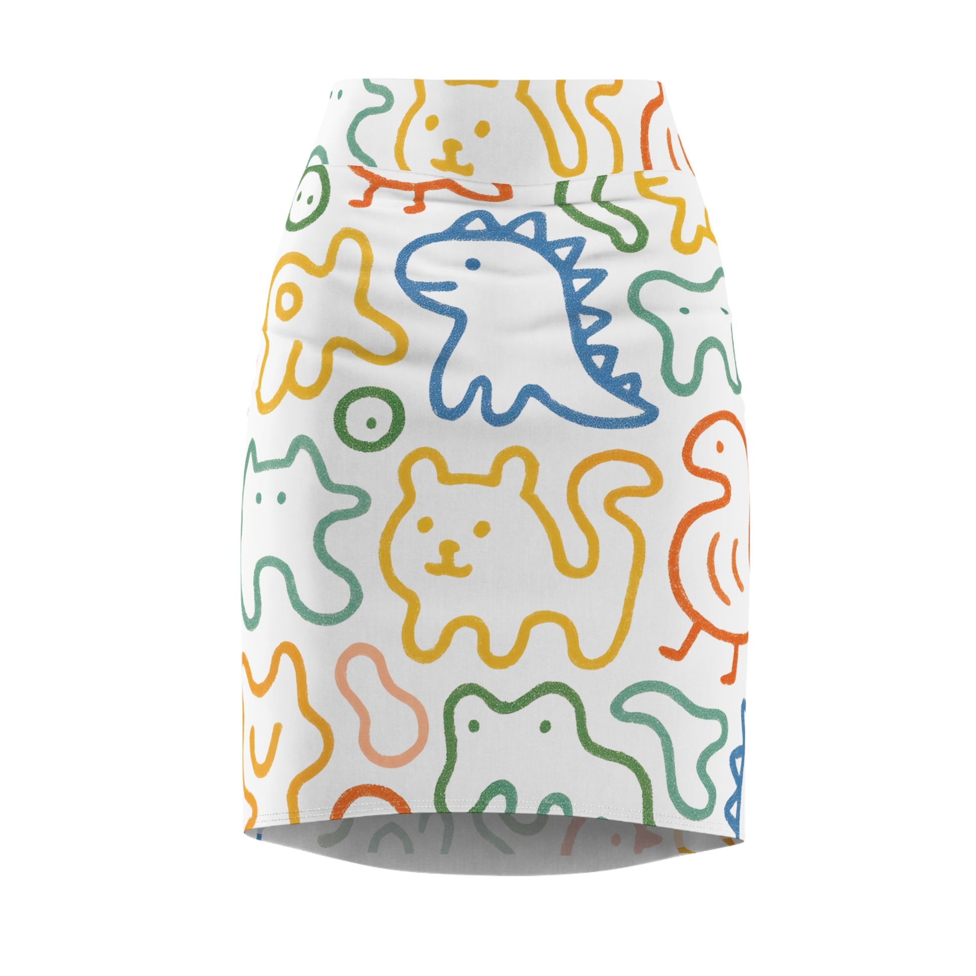 Cute Doodle Animals Pencil Skirt — Colorful Cartoon Dino & Cat All-Over Print