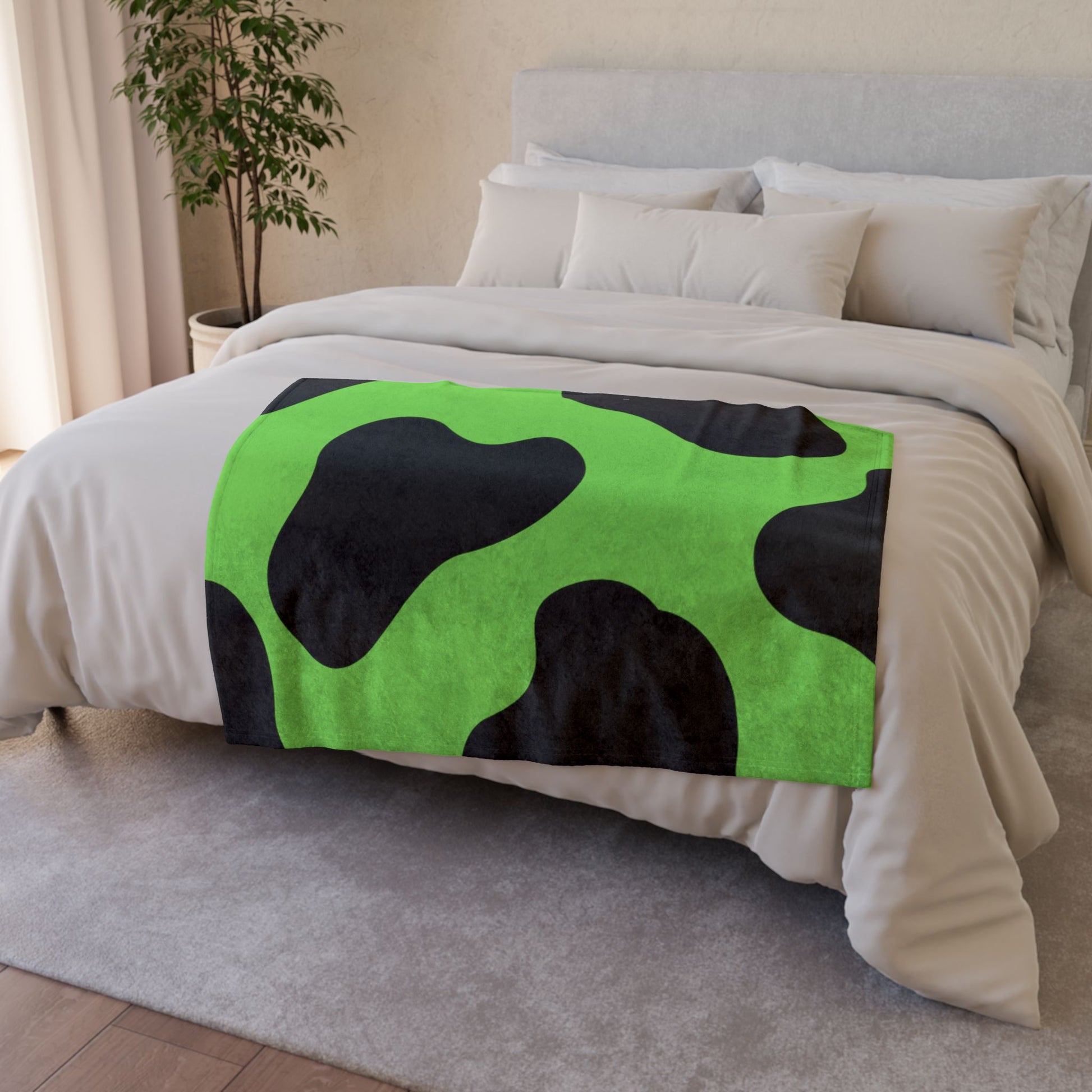 Green & Black Camo Plush Blanket — Abstract Cow-Spot Pattern Cozy Throw