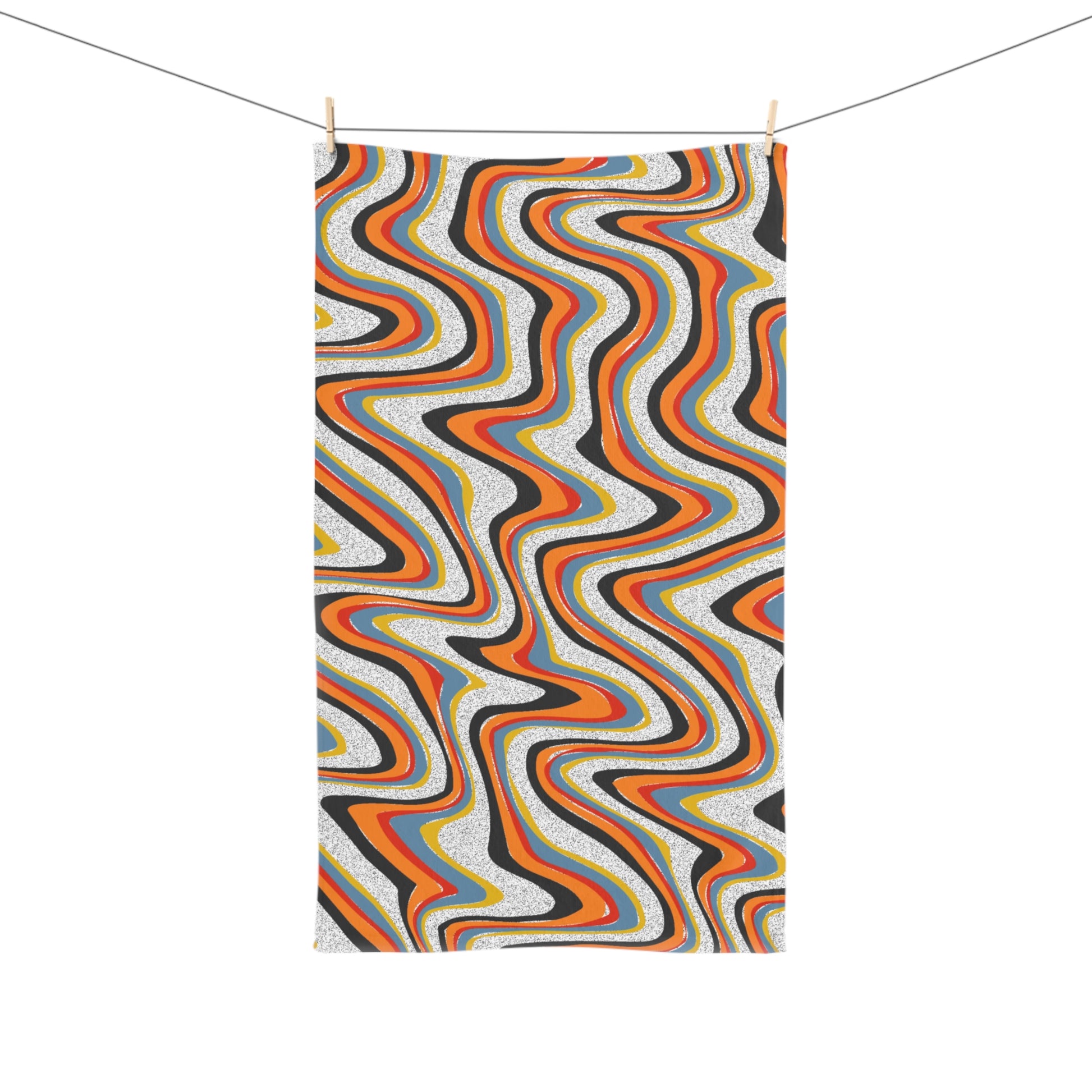 This hand towel brings a playful retro energy to everyday routines. The wavy, 70s-inspired pattern ripples in warm oranges, golds and smoky grays against a soft, slightly textured background — it feels like sunlit vinyl and slow-moving afternoons. Lightweight and absorbent, it slips into a busy kitchen or a small apartment bathroom with ease, adding a splash of vintage color that livens dish duty and quick cleanups. For someone who favors bold patterning over plain linens, this towel reads like a small statement piece: useful, cheerful, and a little nostalgic.