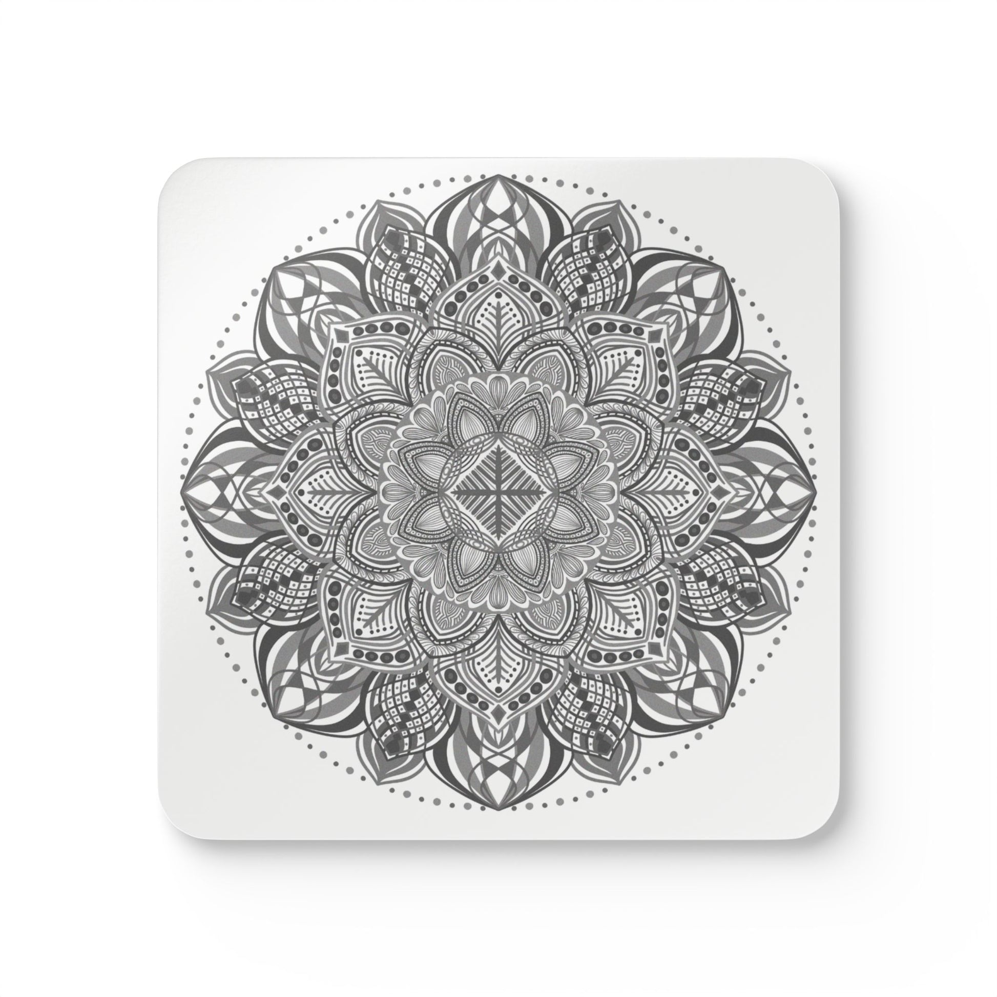 These cork-backed coasters bring calm and intricate beauty to your everyday counter. Each 3.75" square is topped with a glossy MDF surface that catches light and sharpens the fine, hand-drawn mandala lines. The neutral grayscale design reads like a meditative focal point — it grounds a cluttered desk, complements a minimalist coffee setup, and holds an afternoon tea without stealing the scene. The cork underside grips tabletops and keeps the set from sliding while protecting wood from moisture. Light, slim, and made in a set of four, they tuck into a kitchen drawer or sit pretty beside a record player for relaxed moments of ritual.