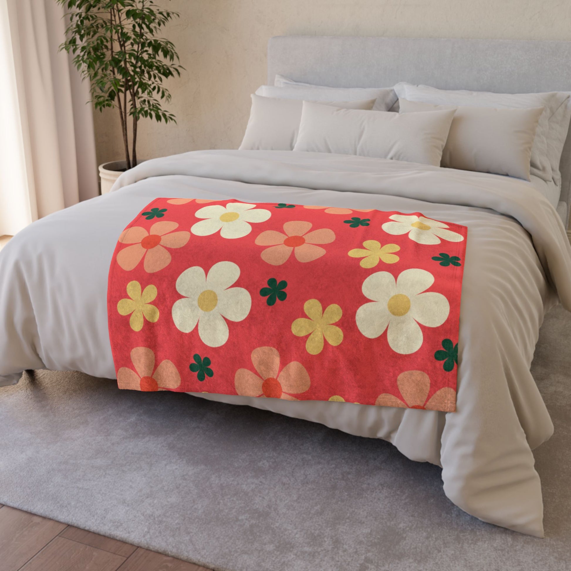 Retro Floral Throw Blanket — Red Daisy Pattern Soft Polyester Blanket