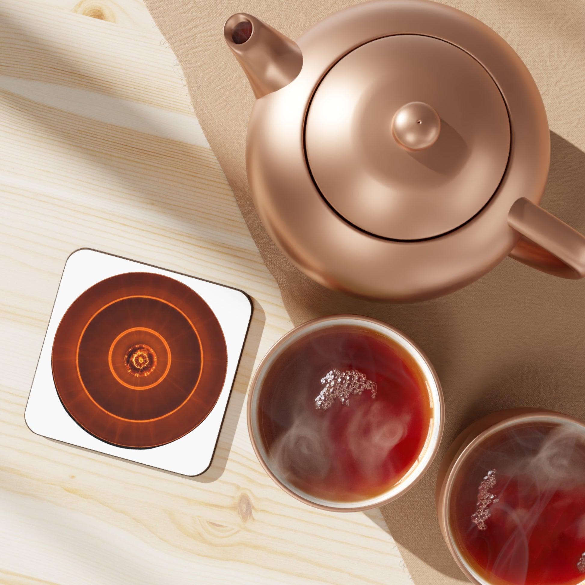 A single hardboard coaster that brings warm, luminous art to your tabletop. The glossy, full-color face shows a deep amber circular design that glows like a captured lantern. Lightweight but sturdy, the hardboard back protects surfaces from ring marks while the vivid print resists fading. Slip it onto your coffee table, nightstand, or bar to anchor a cozy moment — that quiet pause with a steaming mug, a late-night drink, or a friend’s laughter. Assembled in the USA from globally sourced parts, it’s a small, crafted accent that brightens everyday rituals.