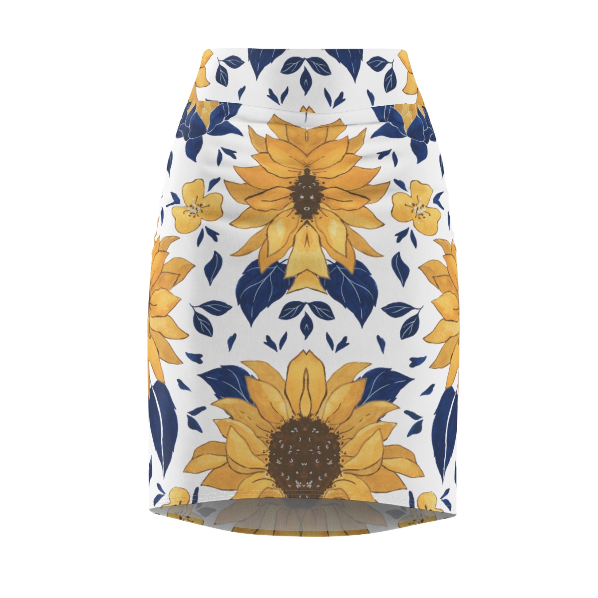 Sunflower Pattern Pencil Skirt — Floral Yellow & Navy AOP